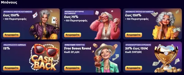 Πέρα από το welcome deal, τρέχουμε συνεχιζόμενες ανταμοιβές που ταιριάζουν σε σταθερά προγράμματα. Κάθε Κυριακή, προσφέρουμε Sunday Reload Bonus με 50% match έως €150, και το Weekly Cashback μας μπορεί να επιστρέψει έως 20% των καθαρών απωλειών κάθε εβδομάδα, βάσει των κανόνων της προσφοράς. Συμμετέχουμε επίσης σε τουρνουά Pragmatic Play Drops & Wins, που φέρνουν prize pools μέσα από events δικτύου. Το SpinGranny παραθέτει τις ενεργές προσφορές σε μία σελίδα, ώστε να βλέπεις τι «τρέχει» τώρα και τι έρχεται στη συνέχεια.